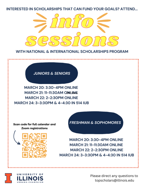 Information Sessions for juniors and seniors (students graduating before August 2024) will be held the week of March 21st. Information sessions will focus on how to apply for June priority application deadlines, including many scholarships for study or research beginning in the fall of 2024: