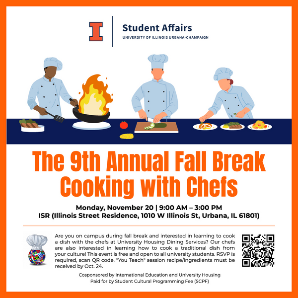 Staying in town for Fall Break? Please join University Housing Dining Services and International Education for our 9th Annual Cooking with Chefs. Tell stories, make new friends, and share warm memories in addition to a delicious celebration meal prepared with and for you and our Chefs. RSVP is required. "You Teach" session recipe/ingredients must be received by Oct. 24.