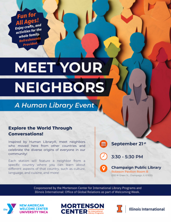 The Mortenson Center, in collaboration with the New American Welcome Center, and Illinois International- Global Relations will have a Human Library Event as part of the events featured during 2025 National Welcoming week. The event will feature immigrants and international students living in Champaign-Urbana as human books. Each human “book” will be available during the event to interact with “readers” and talk to them about their native country. Topics covered in the conversations include among others geographic location, cuisine, languages spoken and culture. Snacks, arts & crafts will be offered as part of the event. Open to all ages!