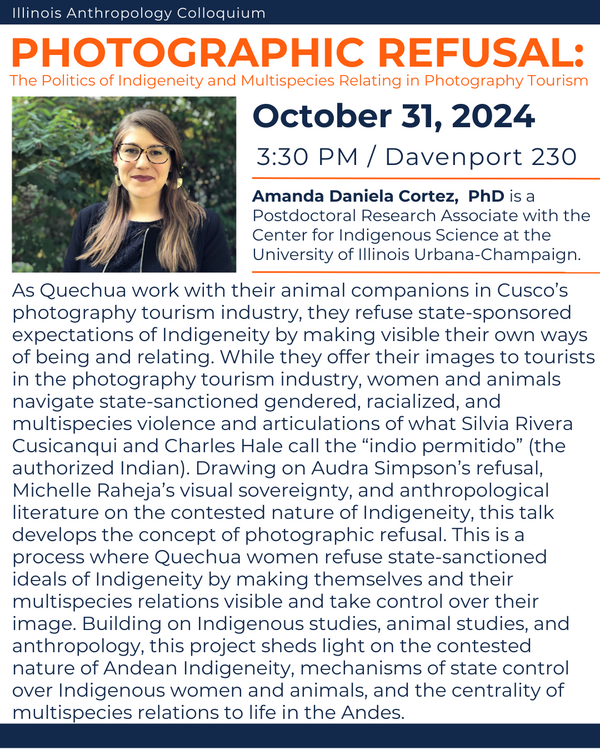 Join Illinois Anthropology on Thursday, October 31, 2024 at 3:30 PM in Davenport Hall 230 for a colloquium by Dr. Amanda Daniela Cortez entitled, Photographic Refusal: The Politics of Indigeneity and Multispecies Relating in Photography Tourism.