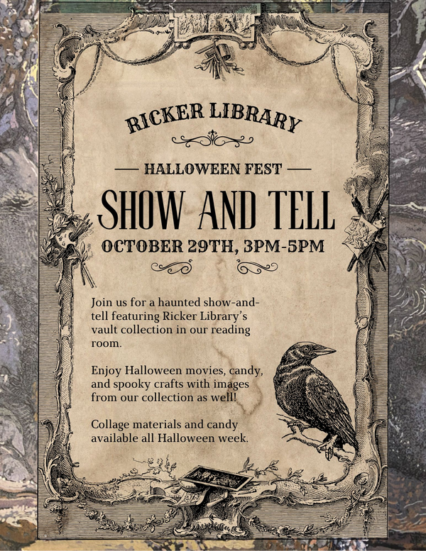 Celebrate Halloween with Ricker Library! On October 29th from 3pm-5pm, we will be hosting a show-and-tell with spooky, fantastical, and curious materials from our vault and circulating collections. We will also have Halloween movies playing in the background and crafting activities ready to go. Collage using pictures from our collections, make an exquisite corpse with your friends, or create a Halloween zine!