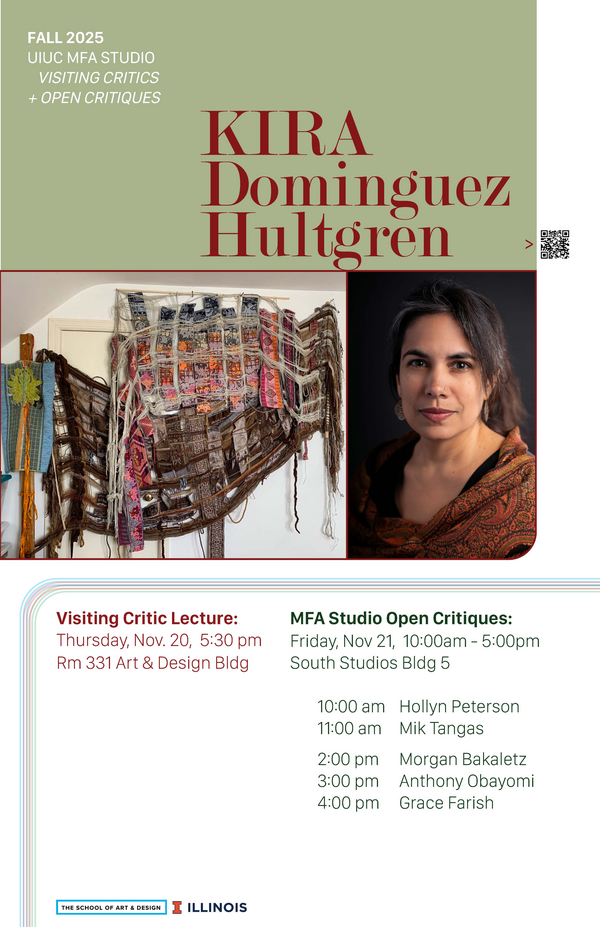 Visiting Critic Kira Dominguez Hultgren will be giving a lecture in room 331 of the Art & Design Building on Thursday, November 20th, 2025 at 5:30p.m.