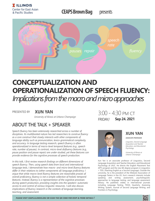 In this talk, I first review research findings on different dimensions of speech fluency. Then, using speech data from local and international language tests, I demonstrate how macro- and micro-level fluency features differ in their relations to (other components of) language proficiency. I argue that while macro-level fluency features are reasonable proxies of overall proficiency, fluency is not a simple collection of holistic temporal features. Instead, fluency is a representation of the cognitive processes during speech production, providing insights into the speakers’ automatic access to and control of various linguistic resources. I will also discuss implications of fluency research in the contexts of language learning, teaching, and assessment.
