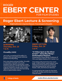 Join us in person or via Zoom for the Roger Ebert Lecture, given by Yiman Wang, professor of film and digital media at UC Santa Cruz. Wang’s lecture will present from her recent book "To Be an Actress," on early Hollywood Chinese-American performer Anna May Wong.
