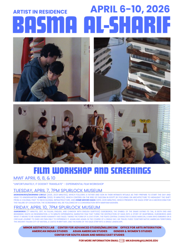 7:00 pmKnight Auditorium, Spurlock Museum, 600 S. GregoryAward-winning Palestinian artist and filmmaker Basma al-Sharif explores cyclical political histories and conflicts. In films and installations that move backward and forward in history, between place and non-place, she confronts the legacy of colonialism through satirical, immersive, and lyrical works.