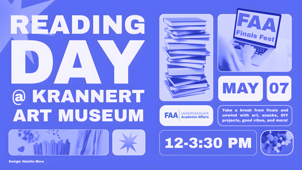 12:00 - 3:30 pmKrannert Art Museum, 500 E. Peabody Drive, ChampaignCalling all students! Come rest up, study, and relax during this semester's Reading Day! Good luck on finals! FAA Finals Fest includes a coffee bar, snacks, study space, and art-making for students. Outlets and study tables will be provided in our galleries for students seeking a calm and inspiring place to study.