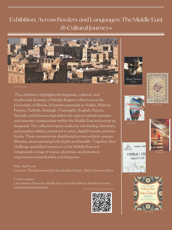 All DayThe International & Area Studies Library, Main Library, 3rd floor.The exhibition highlights the linguistic, cultural, and intellectual diversity of Middle Eastern collections at the University of Illinois. It features materials in Arabic, Hebrew, Persian, Turkish, Amazigh (Tamazight), English, French, Spanish, and German that reflect the region’s plural societies and minority communities within the Middle East and across its diasporas.