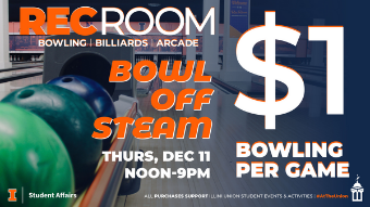 12:00 - 9:00 pmIllini Union Rec RoomBowl Off Steam on Reading Day at the Illini Union Rec Room. All bowling is just $1 per game (shoe rental not included). Bring your friends and enjoy some fun on the lanes.