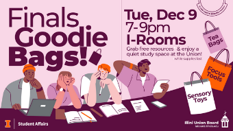 7:00 - 9:00 pmIllini Union I-RoomsStop by and grab some free resources, including sensory toys, tea bags, focus tools, etc. You will also enjoy a quiet study/relaxation space at the Illini Union. (while supplies last)