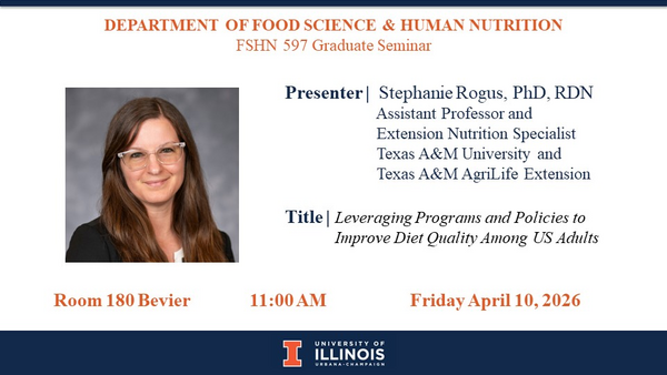 11:00 - 11:50 amBevier Hall- Room 180FSHN Graduate Seminar Presenter: Stephanie Rogus, PhD, RDN Assistant Professor and Extension Nutrition Specialist Texas A&M University and Texas A&M AgriLife Extension Title: Leveraging Programs and Policies to Improve Diet Quality Among US Adults