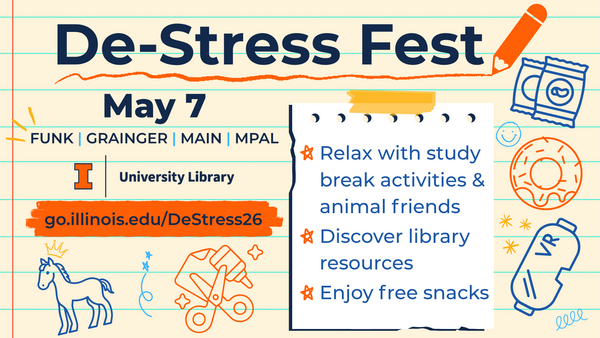 10:00 am - 10:00 pmMain Library, Funk Library, Grainger Engineering Library, and the Music and Performing Arts LibraryOn Reading Day, take a study break to relax and refresh at the library’s end-of-semester tradition, De-Stress Fest! Participating locations include Main Library, Funk Library, Grainger Engineering Library, and the Music and Performing Arts Library (MPAL). Full schedule in description.