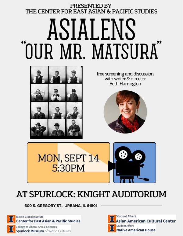 5:30 pmSpurlock Museum, Knight Auditorium 600 S Gregory St, Urbana, IL 61801Our Mr. Matsura, a feature documentary film, is the story of photographer Frank Matsura who journeyed from his native Japan to live in rural Washington State in the early 1900s. The film presents a picture of the “frontier” that departs from the existing popular culture narrative and celebrates the singular contribution of a community-building immigrant artist in America.