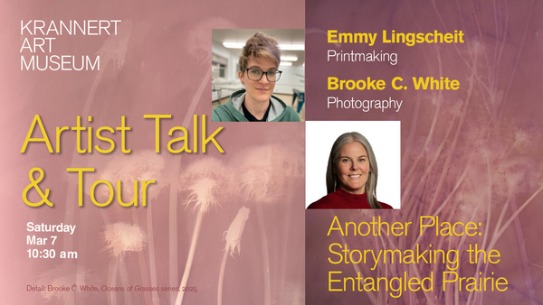 10:30 - 11:30 amKrannert Art Museum, 500 E. Peabody Dr., ChampaignJoin us for a special tour led by exhibiting artists from "Another Place: Storymaking the Entangled Prairie." Gain insights into their creative practice and research. Today's tour features Brooke C. White (photography) and Emmy Lingscheit (printmaking). *Parking nearby is free on after 5 pm and on weekends.*