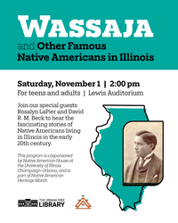 2:00 pmUrbana Free Library, Lewis Auditorium 210 W Green St, Urbana, IL 61801Join professors Rosalyn LaPier and David R. M. Beck at the Urbana Free Library to hear the fascinating stories of Native Americans living in Illinois in the early 20th century.