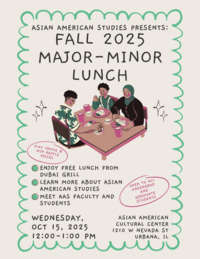 12:00 pm1210 W Nevada St, Urbana, IL 61801Join us on Wednesday, October 15th for our major-minor lunch! You do NOT have to be a part of our program to attend lunch- all students are welcome. Come learn about our department, chat with folks from AAS, and m