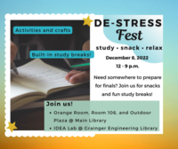 12:00 - 9:00 pm 12/8/2022Main Library, 1408 W. Gregory Drive, UrbanaWe invite you to join us in the Main Library on Thursday, 12/8 for a study break anytime between 12-9 pm for our end-of-the-semester tradition, De-Stress Fest!
