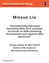 12:00 - 12:30 pm 10/30/2023Charles G. Miller Auditorium, B102 CLSLMonoallelically-expressed Noncoding RNAs form nucleolar territories on NOR-containing chromosomes and regulate rRNA expression