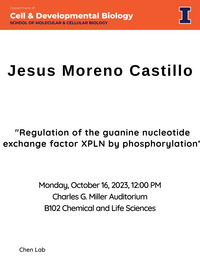 12:00 - 12:30 pm 10/16/2023Charles G. Miller Auditorium, B102 CLSLRegulation of the guanine nucleotide exchange factor XPLN by phosphorylation