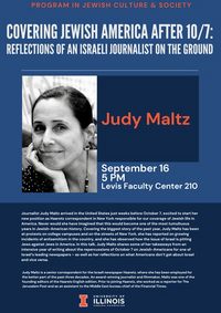 5:00 pm 9/16/2024Levis Faculty Center, Room 210Judy Maltz is a senior correspondent for the Israeli newspaper Haaretz. An award-winning journalist and filmmaker, Maltz was one of the founding editors of the Haaretz English edition. She will share some of her takeaways from an intensive year of writing about the repercussions of October 7 on Jewish Americans for one of Israel's leading newspapers...