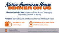 5:30 - 6:30 pm 9/23/2025Asian American Cultural Center (1210 W Nevada St, Urbana)Dinner on Us is administered by the Native American House and is part of the Lunch on Us Series within SSIB. DOU is a biweekly, one-hour program featuring scholar- and practitioner-led workshops alongside a shared meal. Workshops explore a range of subjects and provide participants with opportunities to connect with peers and experts in a casual setting.