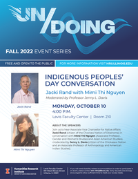 4:00 pm 10/10/2022Levis Faculty Center, Room 210Jacki Rand (Associate Vice Chancellor for Native Affairs, American Indian Studies) in conversation with Mimi Thi Nguyen (Gender & Women's Studies), moderated by Jenny L. Davis (American Indian Studies, Anthropology)