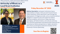 12:00 pm 11/14/2025This noontime presentation will examine both historical and contemporary Native perspectives on higher education, with a focus on land-grant institutions broadly and the University of Illinois specifically.