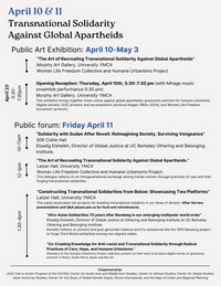 5:30 - 7:30 pm 4/10/2025Murphy Art Gallery, University of YMCAPUBLIC ART EXHIBITION: April 10 - May 3 "The Art of Recreating Transnational Solidarity Against Global Apartheids" Murphy Art Gallery, University YMCA Women Life Freedom Collective and Humane Urbanisms Projects Opening Reception: Thursday, April 10th, 5:30 pm - 7:30 pm (with Mirage music ensemble performance 6:30 pm) Murphy Art Gallery, University YMCA