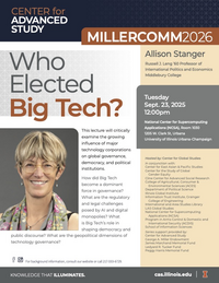 12:00 pm 9/23/2025National Center for Supercomputing Applications (NCSA), Room 1030MillerComm Lecture Series: Who Elected Big Tech? Speaker: Allison Stanger, Middlebury Distinguished Endowed Professorship Provost's Office Tuesday, September 23, 2025, at 12 pm Levis Faculty Center, Room 210, 919 W. Illinois St, Urbana