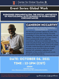 12:00 - 1:00 pm 10/6/2021Prof. Cameron McCarthy will give a presentation that addresses the matter of the management and conservation of histories ("burnished ornamentalism") in three school sites: Barbados, India, and Singapore. These schools form a part of a 5-year, 9-country study of postcolonial elite schools in globalizing circumstances.