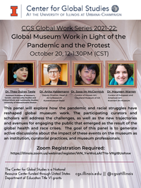 12:00 - 1:30 pm 10/20/2021The participating curators and scholars will address the challenges, as well as the new trajectories and avenues for engaging the public that emerged as the result of the global health and race crises. The goal of this panel is to generate active discussions about the impact of these events on the museum as an institution, curatorial practices, and museum professionals.