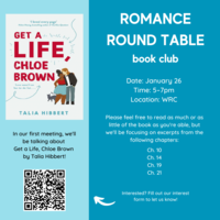 5:00 pm 7:00 PM 1/26/2023Women's Resources Center - 616 E Green St, Suite #202, Champaign IL 61820Join the WRC as we explore "Get a Life, Chloe Brown" by Talia Hibbert, named a Best Romance of 2019 by the TODAY Show!