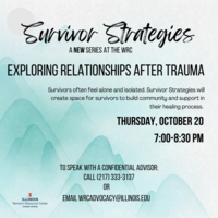 7:00 - 8:30 pm 10/20/2022Women's Resources CenterEach month, the WRC will introduce a new self-care strategy survivors may find useful in healing, or an opportunity for connection around a shared struggle. Survivors often feel alone and isolated. Survivor Strategies will create space for survivors to build community and support in their healing process. Confidential Advisors available at all Survivor Strategies events.