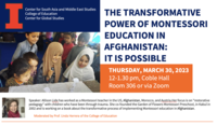 12:00 - 1:30 pm 3/30/2023306 Coble Hall, 801 S Wright St., Champaign, IL-61820Allison Lide has worked as a Montessori teacher in the US, Afghanistan, Morocco, and Austria. Her focus is on "restorative pedagogy" with children who have been through trauma. She co-founded the Garden of Flowers Montessori Preschool in Kabul in 2002 and is working on a book about the transformative process of implementing Montessori education in Afghanistan.