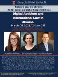 12:00 - 1:00 pm 3/8/2022Join UIUC international law, social informatics, and finance experts for a virtual panel on “Digital Activism and International Law in Ukraine” this Tuesday, March 8th, at 12pm.