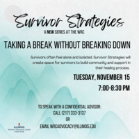 7:00 - 8:30 pm 11/15/2022Women's Resources CenterEach month, the WRC will introduce a new self-care strategy survivors may find useful in healing, or an opportunity for connection around a shared struggle. Survivors often feel alone and isolated. Survivor Strategies will create space for survivors to build community and support in their healing process. Confidential Advisors available at all Survivor Strategies events.