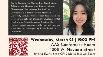 12:00 pm 3/25/20261208 W Nevada St, Urbana, ILCarrie Geng, PhD gives her talk entitled "Madwoman Diaries: Confessional Writing as Mad Practice" on March 25th, 2026 at 12:00 PM in the AAS Conference Room, 1208 W Nevada St.