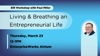 12:00 - 1:00 pm 3/23/2023EnterpriseWorks, 60 Hazelwood DriveJoin us on Thursday, March 23 from 12-1 pm for an EIR Workshop with Paul Miller: Living and Breathing an Entrepreneurial Life. New EIR Paul Miller is no stranger to EnterpriseWorks; he is a co-founder of Agrible, one of our most famous graduates. In this talk, he will share lessons learned as well as advice for other entrepreneurs.