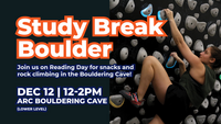 12:00 - 2:00 pm 12/12/2024ARC Bouldering Cave (lower level)Join us on Reading Day for snacks and rock climbing in the Bouldering Cave!