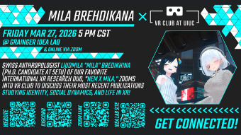 5:00 - 8:00 pm 4/10/2026IDEA Lab, Basement of Grainger Engineering Library Information CenterVR Club at UIUC hosts meetings on Fridays from 4 - 7 PM at the IDEA Lab. Meetings start with MiXR (Meetings involving Extended Reality), an academic forum discussing topics regarding extended reality technology and the metaverse, followed by VR activities. - The Grainger Engineering Library Information Center IDEA Lab