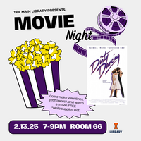 7:00 - 9:00 pm 2/13/2025Main Library Room 66Join us Thursday, 2/13 from 7-9 pm in room 66 of the Main Library to make valentines, get a flower*, and watch the film, "Dirty Dancing." Free! *While supplies last.