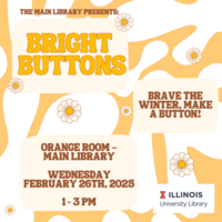 1:00 - 3:00 pm 2/26/2025Main Library Orange RoomLooking for a little flare of sunshine to brighten up wintery February? Then stop by the Orange Room of the Main Library on Wednesday, 2/26 from 1-3 pm to make your very own bright button with our press. Free!