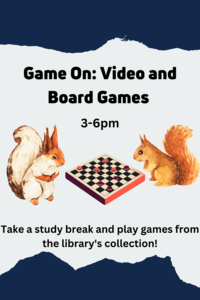 3:00 - 6:00 pm 4/19/2023Main Library, Orange RoomReady to get your game on? Come play board games with your friends and learn more about the Library's video and board game collections and how you can check out games to take home and play. Don't forget to check out the Library's exhibit on Video Games on the way out! Snacks will be provided.