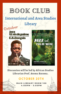4:00 - 5:00 pm 10/20/2021Main Library 106Join the International and Area Studies Library for a monthly discussion of international novels and short stories selected by area specialist librarians. For the month of October the club will be discussing "Jazz and Palm Wine" by Congolese novelist and chemist Emmanuel Dongala.