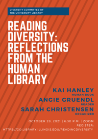 6:30 pm 10/28/2021The Diversity Committee of the University Library invites you to Reading Diversity: Reflections from the Human Library, a panel discussion featuring Kai Hanley, a Human Book; Angie Gruendl, a reader of Human Books; and Sarah Christensen, Human Library organizer; with facilitator George Gottschalk.