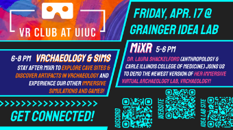 5:00 - 8:00 pm 4/17/2026IDEA Lab, Basement of Grainger Engineering Library Information CenterVR Club at UIUC hosts meetings on Fridays from 4 - 7 PM at the IDEA Lab. Meetings start with MiXR (Meetings involving Extended Reality), an academic forum discussing topics regarding extended reality technology and the metaverse, followed by VR activities. - The Grainger Engineering Library Information Center IDEA Lab