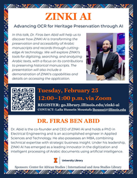 12:00 - 1:00 pm 2/25/2025In this talk, Dr. Firas ben Abid will help us to discover how ZINKI AI is transforming the preservation and accessibility of Arabic manuscripts and records through cutting-edge AI technology. We will explore ZINKI's tools for digitizing, searching, and analyzing Arabic texts, with a focus on its contributions to preserving historical manuscripts.