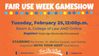 12:00 pm 2/25/2025College of Law, 504 E. Pennsylvania Avenue, ChampaignJoin us for an interactive Fair Use Gameshow to celebrate Fair Use Week! Your host, Sara Benson (Library) will be joined by an all-star panel including Pia Hunter (Law), Dr. Melissa Ocepek (iSchool), and Andrea Augustine (Law). Register for free at https://go.illinois.edu/fairuseweek to attend online or attend in-person (Room A, College of Law).