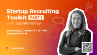 12:00 - 1:00 pm 10/4/2023EnterpriseWorks, 60 Hazelwood DriveJoin us on Wednesday, October 4 from 12:00-1:00 pm for Startup Recruiting Toolkit Part I with Sophie Roney.