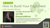 12:00 - 1:00 pm 11/15/2022EnterpriseWorks, 60 Hazelwood DriveJoin us on Tuesday, November 15 from 12:00-1:00 PM for an EIR Workshop with Gerald Wilson on How to Build Your Pitch Deck.