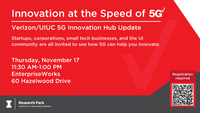 11:30 am - 1:00 pm 11/17/2022EnterpriseWorks, 60 Hazelwood Drive, ChampaignThe potential for Verizon and UIUC Research Park community to collaborate and innovate toward a connected future is huge. This session introduces a pathway on how that can be realized. Verizon invites companies that are present in this community, including startups, large corporations, or tech companies of any size, to come join us in this event.